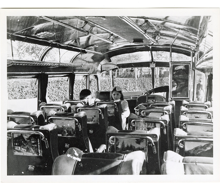 Interior view of a Zin bus, showing seats. Girl in background. Handwritten on back: "Zin (Italy)."