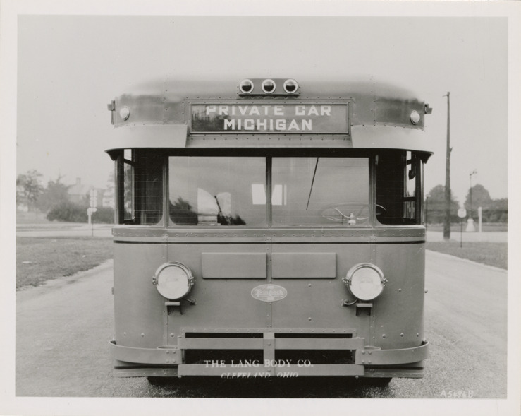 Front view of a Fageol Twin Coach bus. Printed on front: "The Lang Body Co., Cleveland, Ohio." Handwritten on back: "Fageol Twin Coach. Probably belonged to Detroit Motor Bus Co."