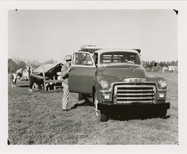 Favorite this☆ 1954 GMC truck on farm Description: View of a 1954 GMC truck on a farm. Cows in background. Handwritten on back: "GMC SP-889, 1954." Details Resource ID: na049889 Subject: GMC trucks Cows Photographic prints Date Issued: Unknown year Format: 1 photographic print ; 4 x 5 in. Member of: National Automotive History Collection Filing Location: MS121/VanDegrift, Thomas, 8:5 Rights: Physical rights are retained by DPL. Copyright is retained in accordance with U.S. copyright laws.