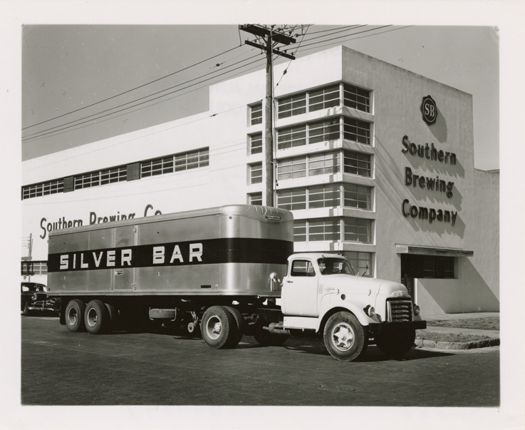 Favorite this☆ 1954 GMC truck and trailer at Southern Brewing Company Description: View of a 1954 GMC truck with trailer at the Southern Brewing Company. "Silver Bar" is painted on trailer. Handwritten on back: "GMC SP-888, 1954." Details Resource ID: na049891 Subject: GMC trucks Truck trailers Photographic prints Date Issued: Unknown year Format: 1 photographic print ; 4 x 5 in. Member of: National Automotive History Collection Filing Location: MS121/VanDegrift, Thomas, 8:5 Rights: Physical rights are retained by DPL. Copyright is retained in accordance with U.S. copyright laws.