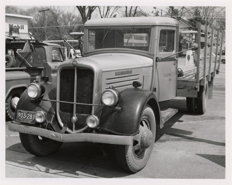View of a GMC truck. Handwritten on back: "GMC."