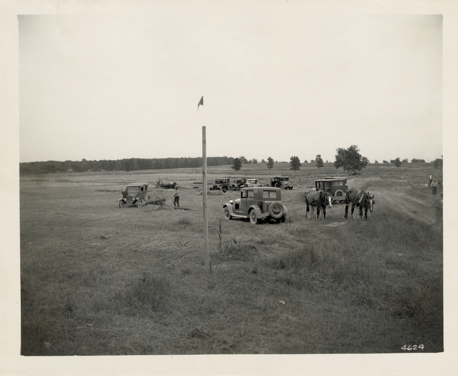 View of the site for the General Motors Truck Plant (also Yellow Truck and Coach Manufacturing Company) at Pontiac, Michigan. Cars and horses on site. Handwritten on back: "Site, General Motors Truck Plant, Pontiac, MI. 5 Jul 1927."