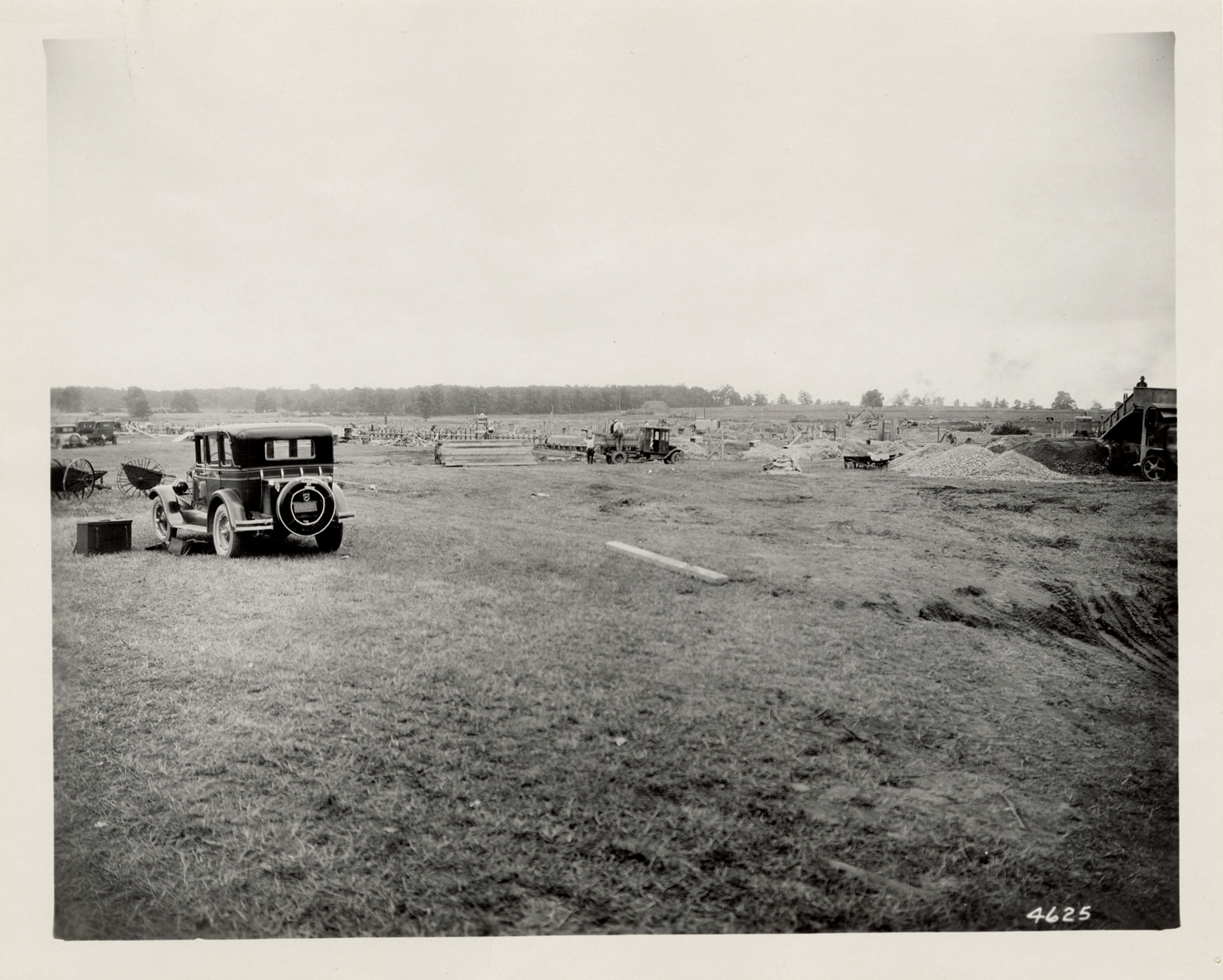 View of the General Motors Truck Plant (also Yellow Truck and Coach Manufacturing Company) during construction at Pontiac, Michigan. Trucks, automobiles, equipment and building materials on site. Label on back: "Comparative view of the sight [sic] on which the 660 x 1820 foot factory buildings of the General Motors Truck Co. are being erected. Photograph no. 4624 was taken July 5th, 1927, the day on which President Paul A. [sic] turned the first sod. Photograph no. 4625 was taken July 14, 1927, just eight days later, showing progress of construction. Both views were taken from exactly the same spot."