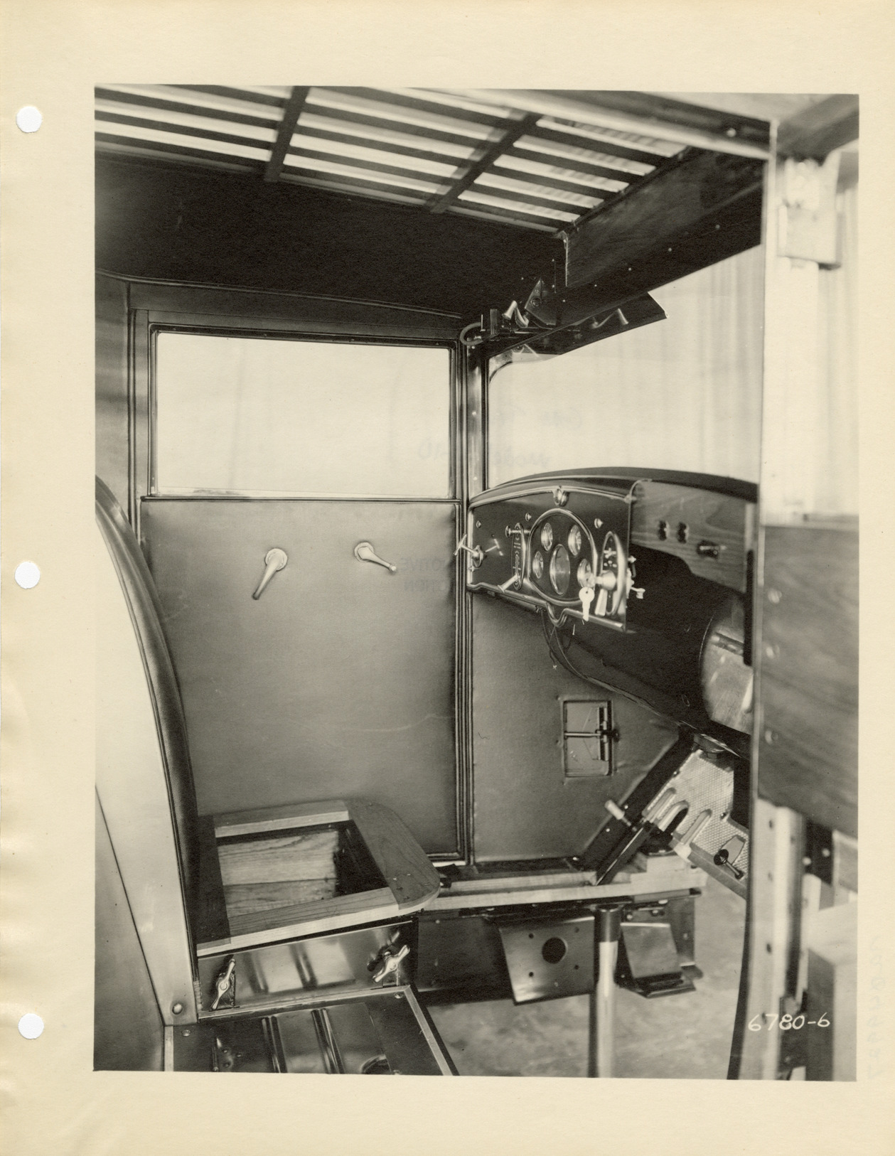 View of the interior of a GMC truck during construction. Handwritten on back: "GM truck. Model 0-10."