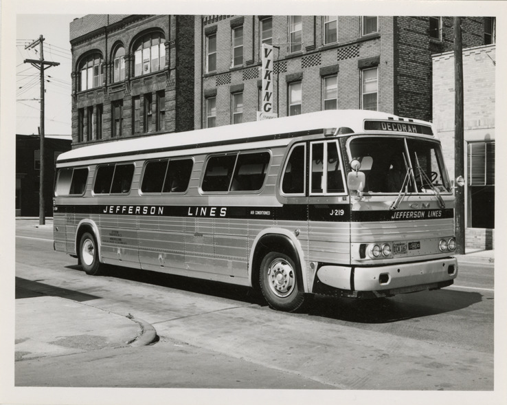 Favorite this☆ Jefferson Transportation Company bus Description: View of a Jefferson Transportation Company bus. Stamped on back: "Aug 16 1964." Handwritten on back: "Jefferson Transportation." Details Resource ID: na049947 Subject: Buses Jefferson Transportation Company Photographic prints Date Issued: 1964-08-16 Format: 1 photographic print ; 4 x 5 in. Member of: National Automotive History Collection Filing Location: MS121/VanDegrift, Thomas, 12:2 Rights: Physical rights are retained by DPL. Copyright is retained in accordance with U.S. copyright laws.