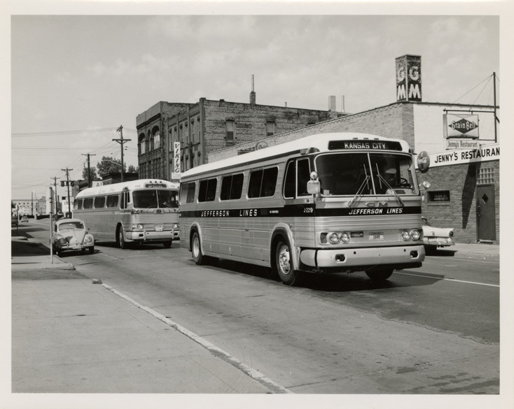 Favorite this☆ Jefferson Transportation Company bus Description: View of a Jefferson Transportation Company bus, followed by an unidentified bus. Stamped on back: "Aug 16 1964." Handwritten on back: "Jefferson Transportation." Details Resource ID: na049951 Subject: Buses Jefferson Transportation Company Photographic prints Date Issued: 1964-08-16 Format: 1 photographic print ; 4 x 5 in. Member of: National Automotive History Collection Filing Location: MS121/VanDegrift, Thomas, 12:2 Rights: Physical rights are retained by DPL. Copyright is retained in accordance with U.S. copyright laws.