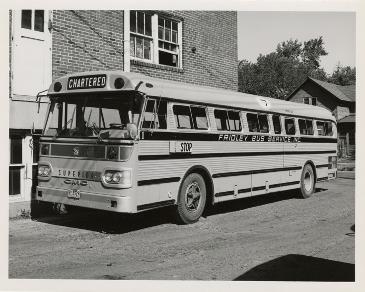 View of a Jefferson Transportation Company bus for Fridley Bus Service. Stamped on back: "Aug 17 1964." Handwritten on back: "Jefferson Transportation."