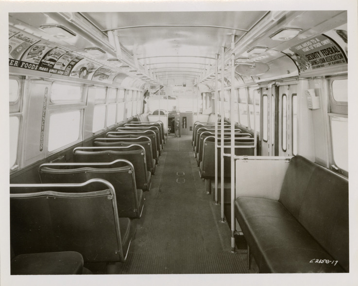 View of the interior of a 1952 Mack bus, showing seats. Handwritten on back: "Mack DT 1952. 39' 11" overall length. 102" wide. 672 Mack diesel 200 HP."