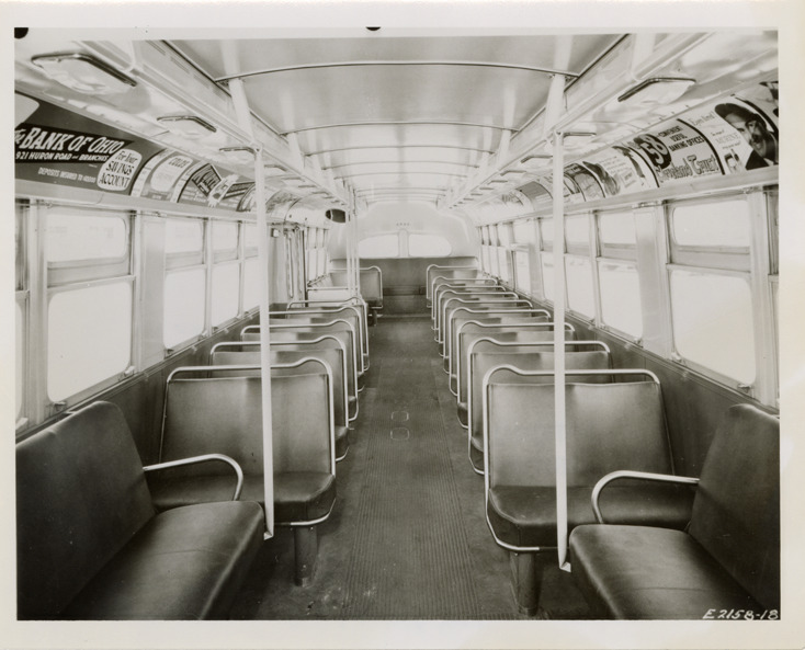 View of the interior of a 1952 Mack bus, showing seats. Handwritten on back: "Mack DT 1952. 39' 11" overall length. 102" wide. 672 Mack diesel 200 HP."