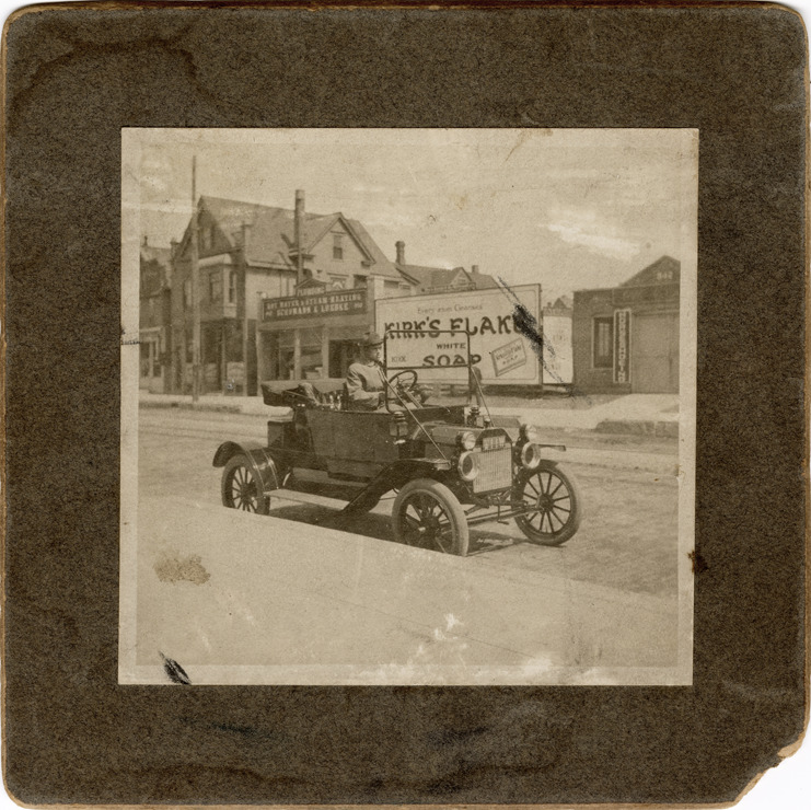Favorite this☆ Motorist posing in Ford automobile Description: View of motorist posing in a Ford car. Billboard for Kirk's flake white soap in background. Handwritten on back: "Ford, ca. 1912." Details Resource ID: na049995 Subject: Ford automobile Billboards Advertising--Soap Photographic prints Date Issued: Unknown year Format: 1 photographic print mounted on mat board ; image 3.5 x 3.5 in. Member of: National Automotive History Collection Filing Location: Ford, 1911-1912 Rights: Physical rights are retained by DPL. Copyright is retained in accordance with U.S. copyright laws.