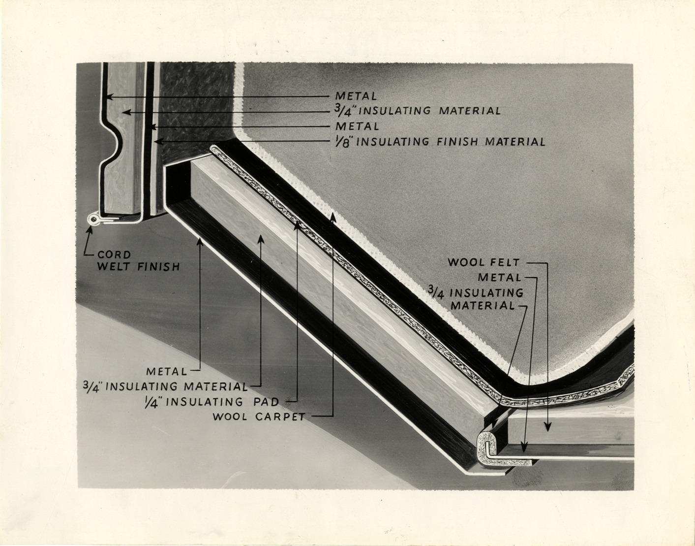 Favorite this☆ Body insulation chart, 1932 Packard automobile Description: Artist's depiction of a body insulation chart for a 1932 Packard automobile. Typed on back: "Ninth series--Mechanical." Handwritten on back: "1932 Packard, Ninth series, all models. (All body types). Body insulation chart (with lettering)." Details Resource ID: na050072 Subject: Packard automobile Insulation (Heat) Photographic prints Date Issued: 1931-09-28 Format: 1 photographic print mounted on fabric ; 7.5 x 9.5 in. Member of: National Automotive History Collection Packard Collection Filing Location: Packard, 1932 Negative Number: 1383-C Rights: Physical rights are retained by DPL. Copyright is retained in accordance with U.S. copyright laws.