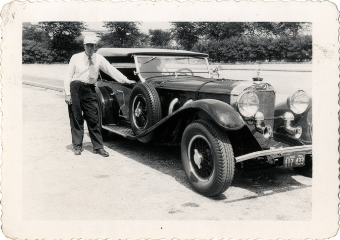 View of a man posing with a 1930 Mercedes Model SS car. Handwritten on back: "Mercedes SS, 1930."