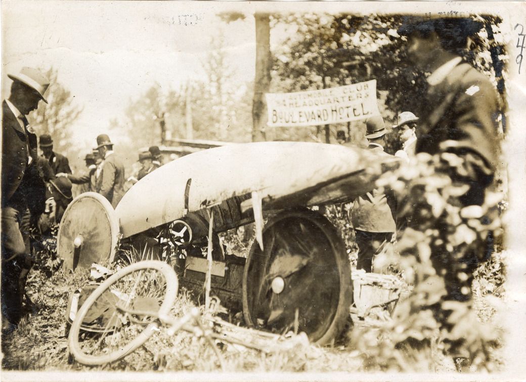 View of aftermath of accident involving Ross Steamer car. Onlookers and policemen on scene; "Automobile Club headquarters, Boulevard Hotel" sign in background. Handwritten on back: "Ross St."