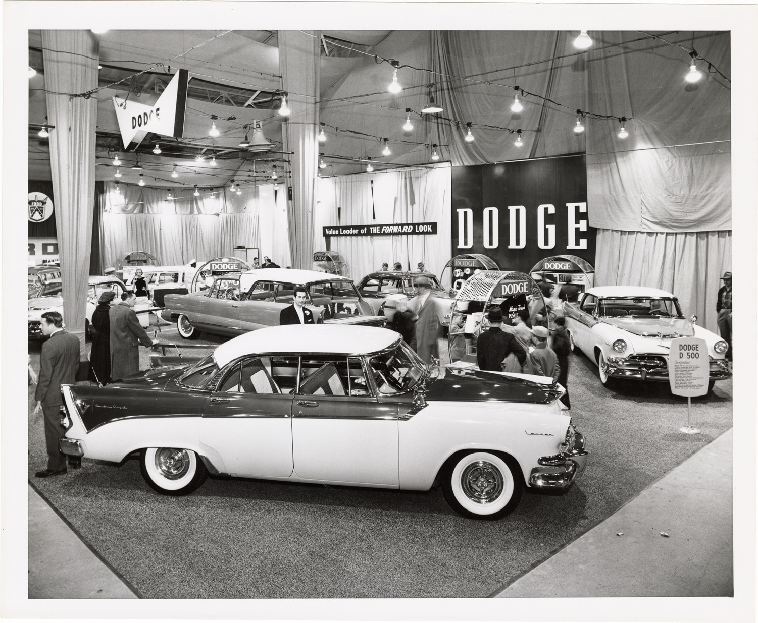 Favorite this☆ Dodge automobiles on exhibit, 1956 Detroit Auto Show Description: View of Dodge cars on exhibit at 1956 Detroit Auto Show. Dodge Lancer in foreground. "Dodge D 500" sign on right; "Dodge" sign in background. Typed on back: "43rd Auto Show." Details Resource ID: na050190 Subject: Dodge Lancer automobile Dodge automobile Trade shows--Michigan--Detroit Detroit Auto Show (43rd : 1956) Photographic prints Date Issued: 1956 Format: 1 photographic print ; 8 x 10 in. Member of: National Automotive History Collection Filing Location: Shows--Detroit, 1956 Rights: Physical rights are retained by DPL. Copyright is retained in accordance with U.S. copyright laws.