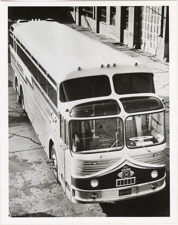 View of a 1956 Continental Trailways Golden Eagle bus. Handwritten on back: "Trailways Continental Golden Eagle, 1956."