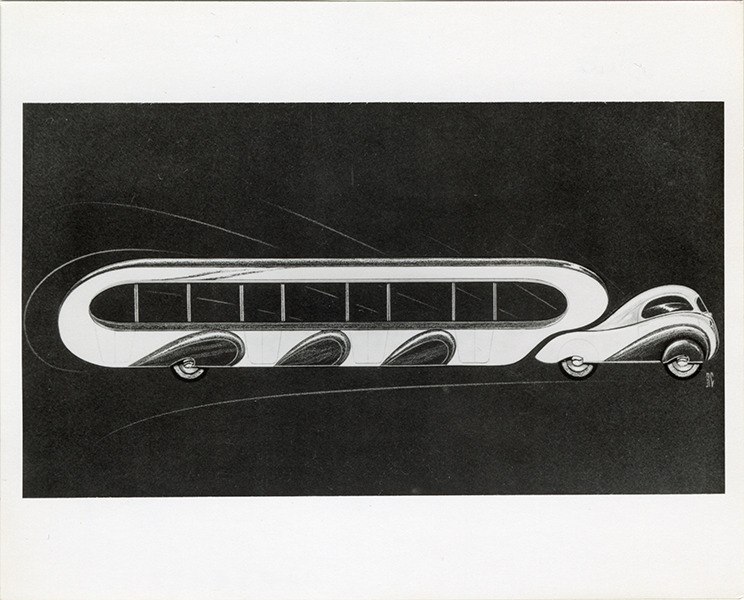 Artist's depiction of a White trailer bus for Greyhound Lines. Handwritten on back: "White. Greyhound tractor for 1939 World's Fair (drawing). Believed to be never built."