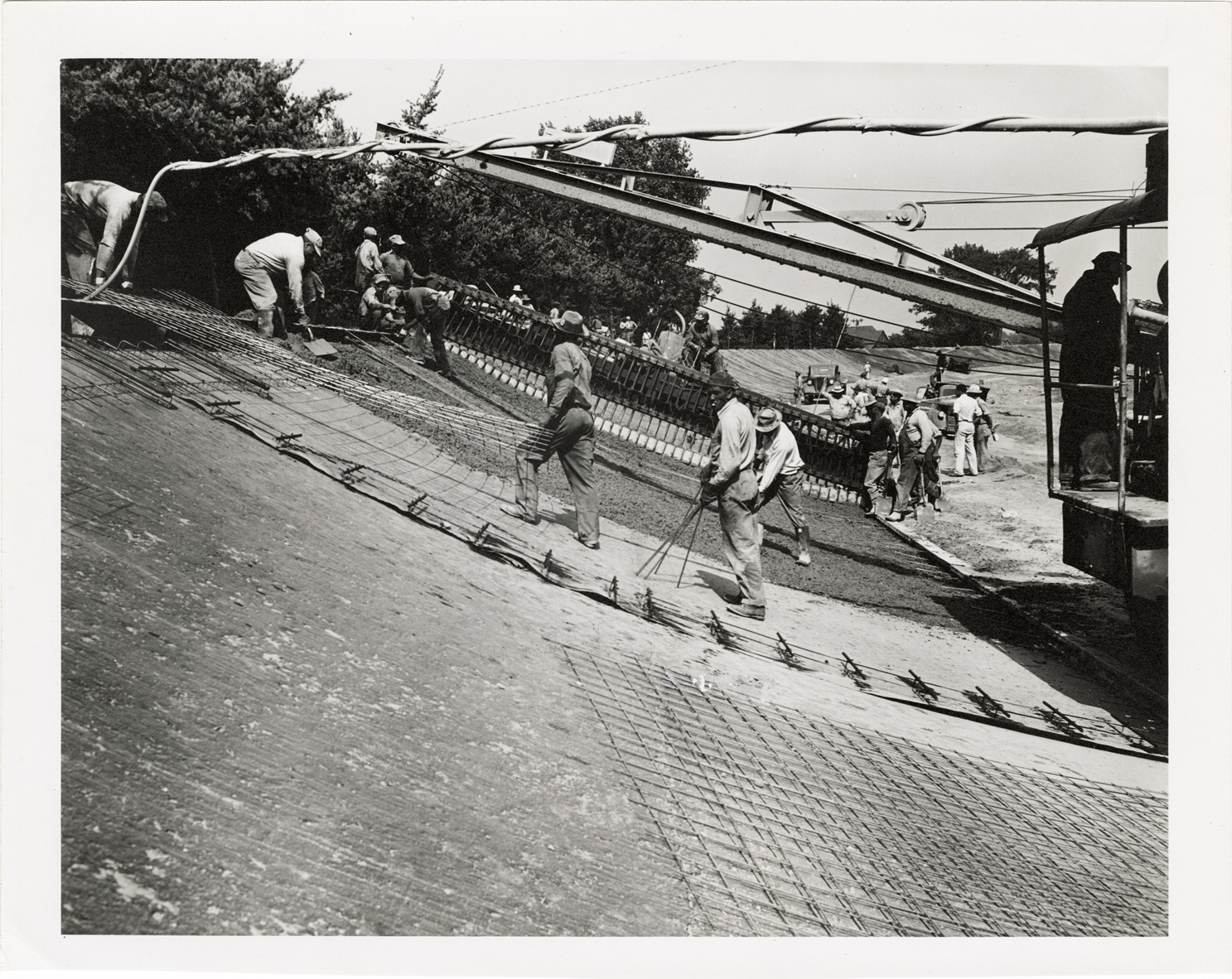 View of workers resurfacing the track at the Packard Proving Grounds in Utica, Michigan. Typed on back: "Proving grounds, track. Top elevation." Stamped on back: "Sep 5, 1946." Handwritten on back: "Packard Motor Car Co. Proving Grounds, Utica, Michigan. Resurfacing track."