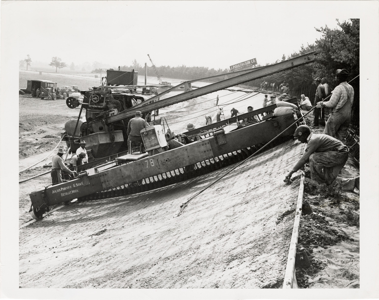 View of workers resurfacing the track at the Packard Proving Grounds in Utica, Michigan. Equipment is from Julius Porath & Son, Detroit, Mich. Typed on back: "Proving grounds, track. Top elevation." Stamped on back: "Sep 5, 1946." Handwritten on back: "Packard Motor Car Co. Proving Grounds, Utica, Michigan. Resurfacing track."