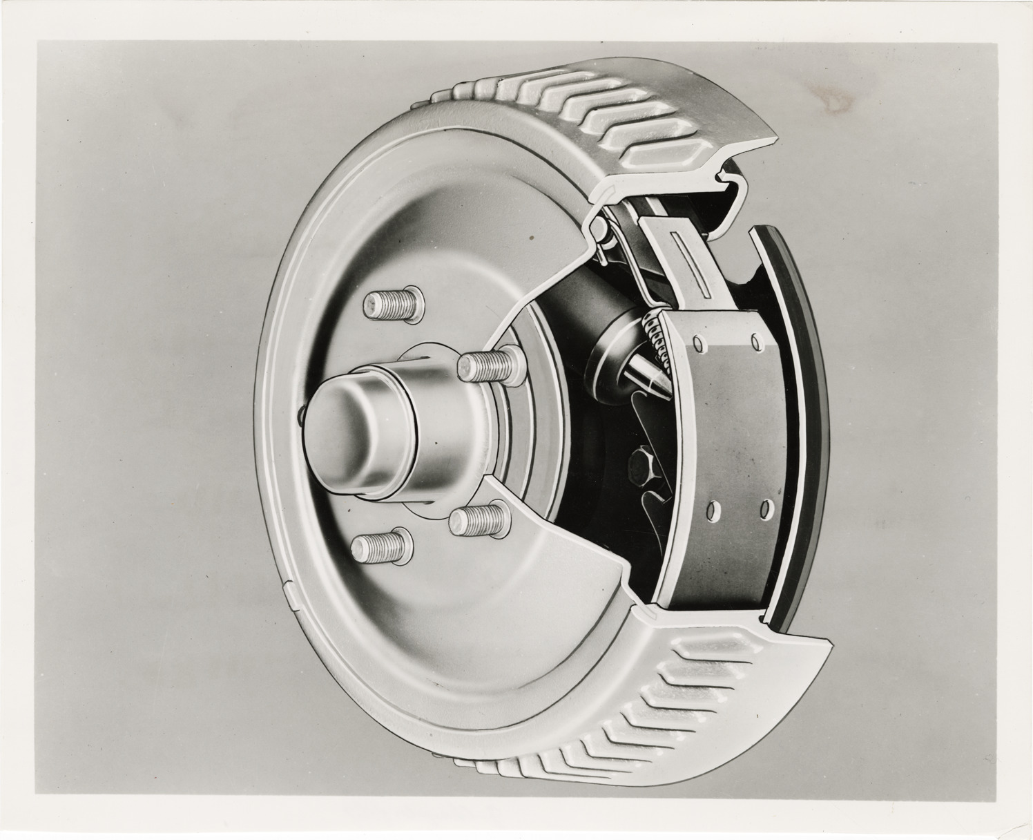 Artist's depiction of the finned-brake drum for the 1956 Studebaker cars. Label on back: "One of the important new safety features in the automotive industry is the finned-brake drum to be used on the brakes of Studebaker's 1956 President models and Golden Hawk sports type cars. In providing increased surface area and greater air circulation, these fins contain a consistent cooling effectiveness on the drums and lining. As a result, these new brakes resist the heat 'fading' to which most ordinary brakes are susceptible, and sustain high braking efficiency even under driving conditions where brakes must be applied frequently at moderate and higher speeds. From: Public Relations Department, Studebaker-Packard Corporation. Detroit 32, Michigan. Walnut 1-5600."