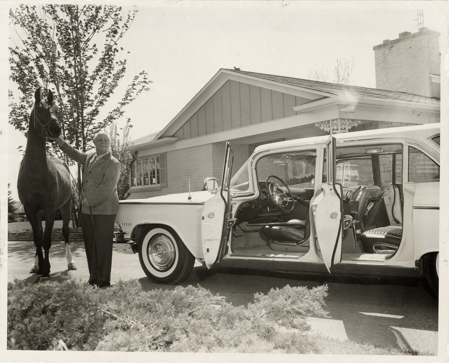 View of Don R. Mitchell posing with a horse and a 1959 Buick Texan Invicta station wagon. Handwritten on back: "Buick Texan Invicta station wagon, 1959. Don R. Mitchell (1903-2014) of Mitchell Corp., Ionia & Owosso, MI."