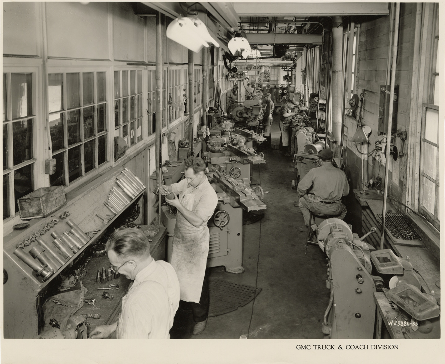 Favorite this☆ Workers in tool repair room, Plant 4, GMC Truck & Coach Division factory Description: View of workers in the tool repair room, Plant 4 engine machine shop, GMC Truck & Coach plant. Printed on front: "GMC Truck & Coach Division." Handwritten on back: "Factories--GMC. Plant 4, engine machine shop, tool repair room, ca. 1943." Details Resource ID: na050270 Subject: Automobile industry workers--Michigan--Pontiac Automobile factories--Michigan--Pontiac GMC Truck & Coach Tools--Maintenance and repair Photographic prints Date Issued: 1943 (year approximate) Format: 1 photographic print ; 8 x 9.5 in. Member of: National Automotive History Collection Filing Location: Factories--GMC, ca. 1943, #1 Rights: Physical rights are retained by DPL. Copyright is retained in accordance with U.S. copyright laws.