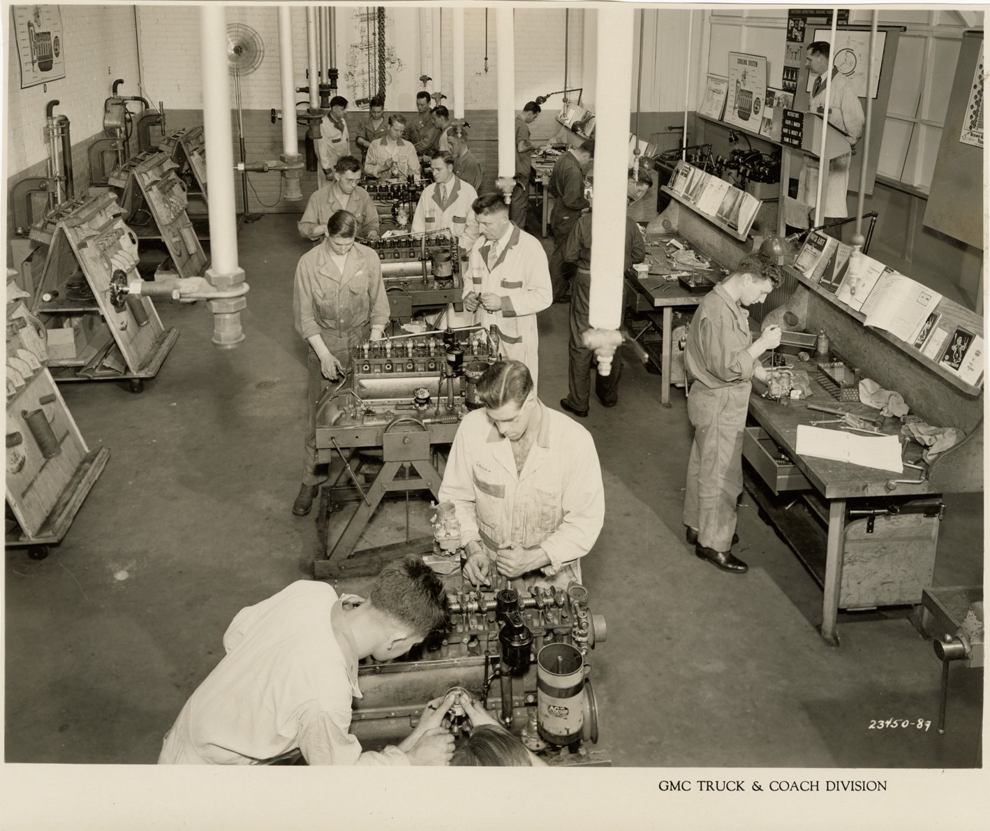 Favorite this☆ Workers on connecting rod machining line, Plant 4, GMC Truck & Coach Division factory Description: View of workers on connecting rod machining line, Plant 4 engine machine shop, GMC Truck & Coach plant. Printed on front: "GMC Truck & Coach Division." Handwritten on back: "Factories--GMC. Plant 4, engine machine shop, connecting rod line machining, ca. 1943." Details Resource ID: na050272 Subject: Automobile industry workers--Michigan--Pontiac Women automobile industry workers--Michigan--Pontiac Automobile factories--Michigan--Pontiac GMC Truck & Coach Photographic prints Date Issued: 1943 (year approximate) Format: 1 photographic print ; 8 x 9.5 in. Member of: National Automotive History Collection Filing Location: Factories--GMC, ca. 1943, #1 Rights: Physical rights are retained by DPL. Copyright is retained in accordance with U.S. copyright laws.