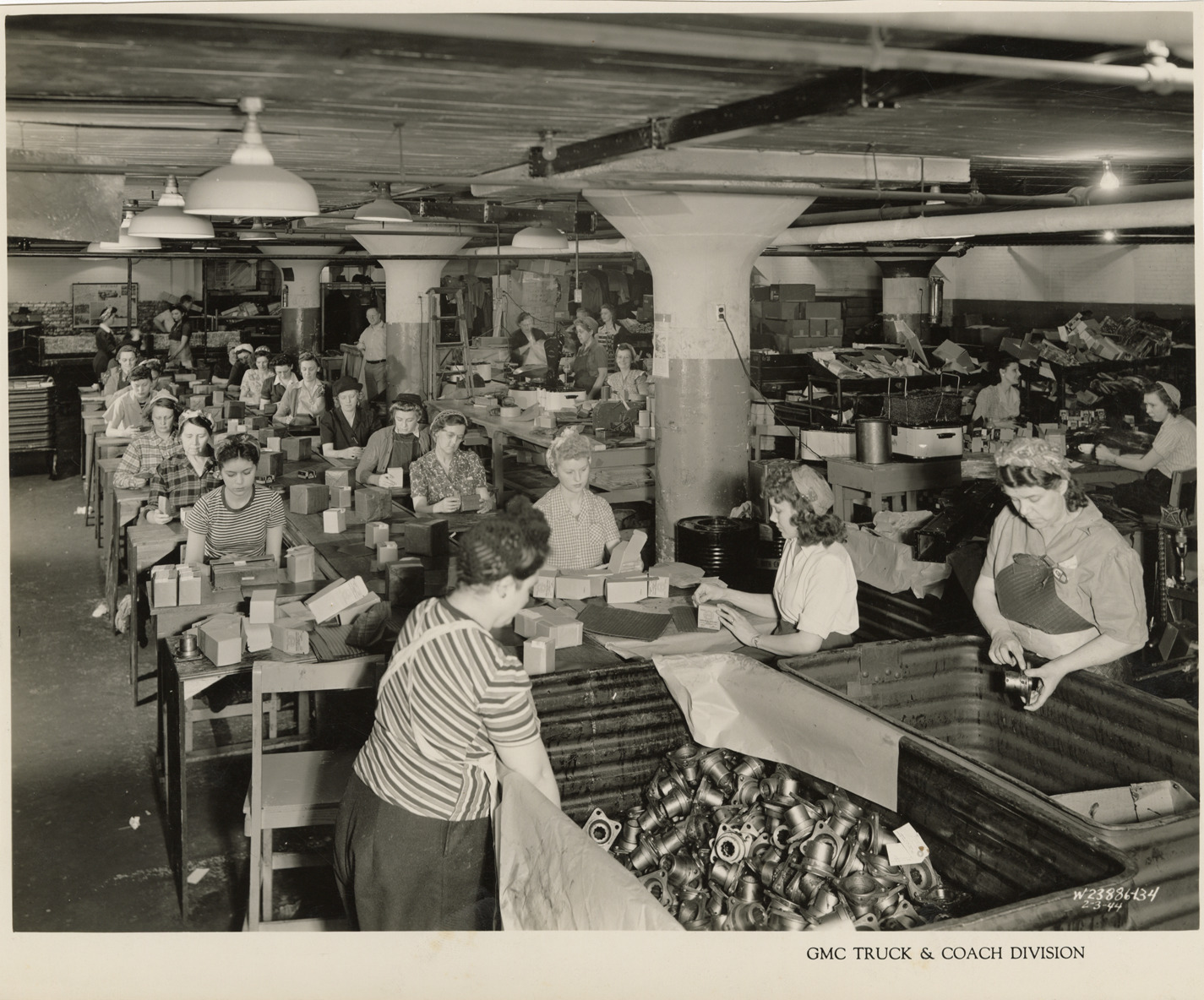 View of women workers packing parts in boxes, GMC Truck & Coach plant. Printed on front: "GMC Truck & Coach Division. 2-3-44." Handwritten on back: "Factories--GMC, ca. 1943."