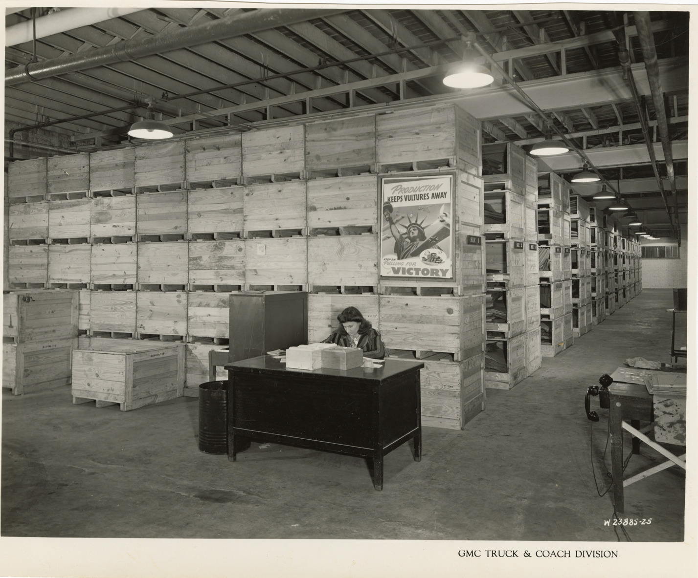 View of a woman working at desk in warehouse at the GMC Truck & Coach plant. "Production keeps vultures away. Keep 'em pulling for victory" poster displayed behind desk. Wooden crates on warehouse shelves. Printed on front: "GMC Truck & Coach Division." Handwritten on back: "Factories--GMC, ca. 1943."