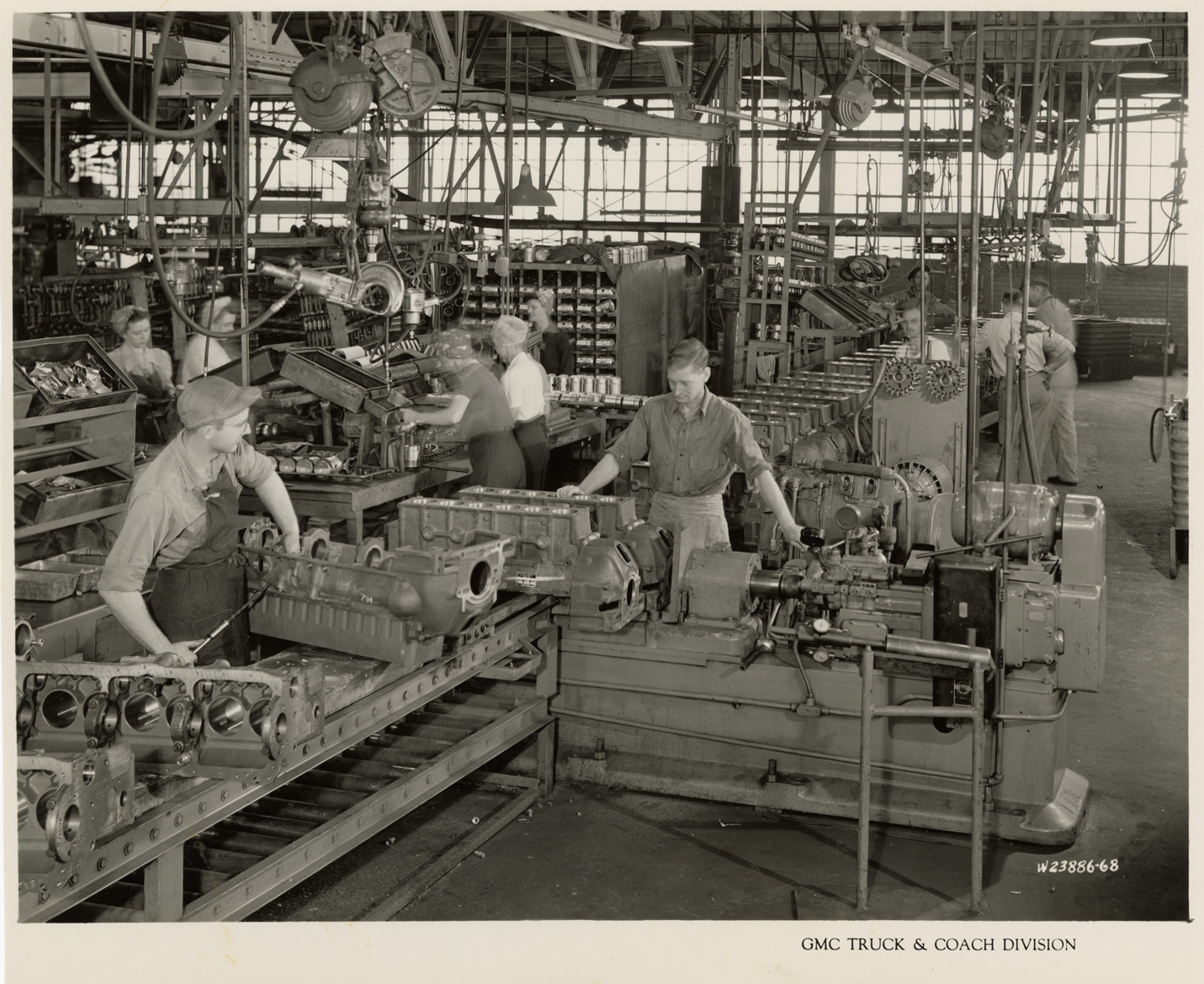 Favorite this☆ Workers assembling cylinder heads, Plant 4, GMC Truck & Coach Division factory Description: View of workers assembling cylinder heads at Plant 4, Engine Assembly, Bldg. 20, GMC Truck & Coach plant. Printed on front: "GMC Truck & Coach Division." Handwritten on back: "Plant 4, Engine Assembly, Bldg. 20, third floor. Bearing cap & cylinder block assembly. Factories--GMC, ca. 1943." Details Resource ID: na050288 Subject: Automobile industry workers--Michigan--Pontiac Motor vehicles--Motors--Cylinder heads Automobile factories--Michigan--Pontiac GMC Truck & Coach Assembly-line methods Photographic prints Date Issued: 1943 (year approximate) Format: 1 photographic print ; 8 x 9.5 in. Member of: National Automotive History Collection Filing Location: Factories--GMC, ca. 1943, #1 Rights: Physical rights are retained by DPL. Copyright is retained in accordance with U.S. copyright laws.