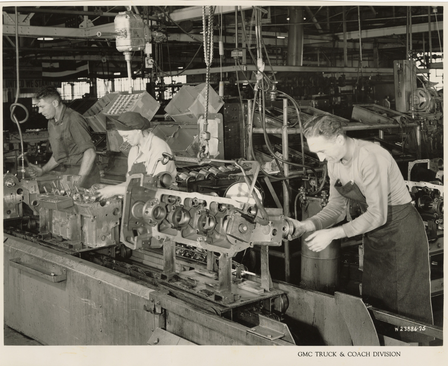 View of men and women workers inserting piston and rod assemblies at Plant 4, Engine Assembly, Bldg. 20, GMC Truck & Coach plant. Printed on front: "GMC Truck & Coach Division." Handwritten on back: "Plant 4, Engine Assembly, Bldg. 20, third floor. Inserting piston & rod assemblies on line. Factories--GMC, ca. 1943."