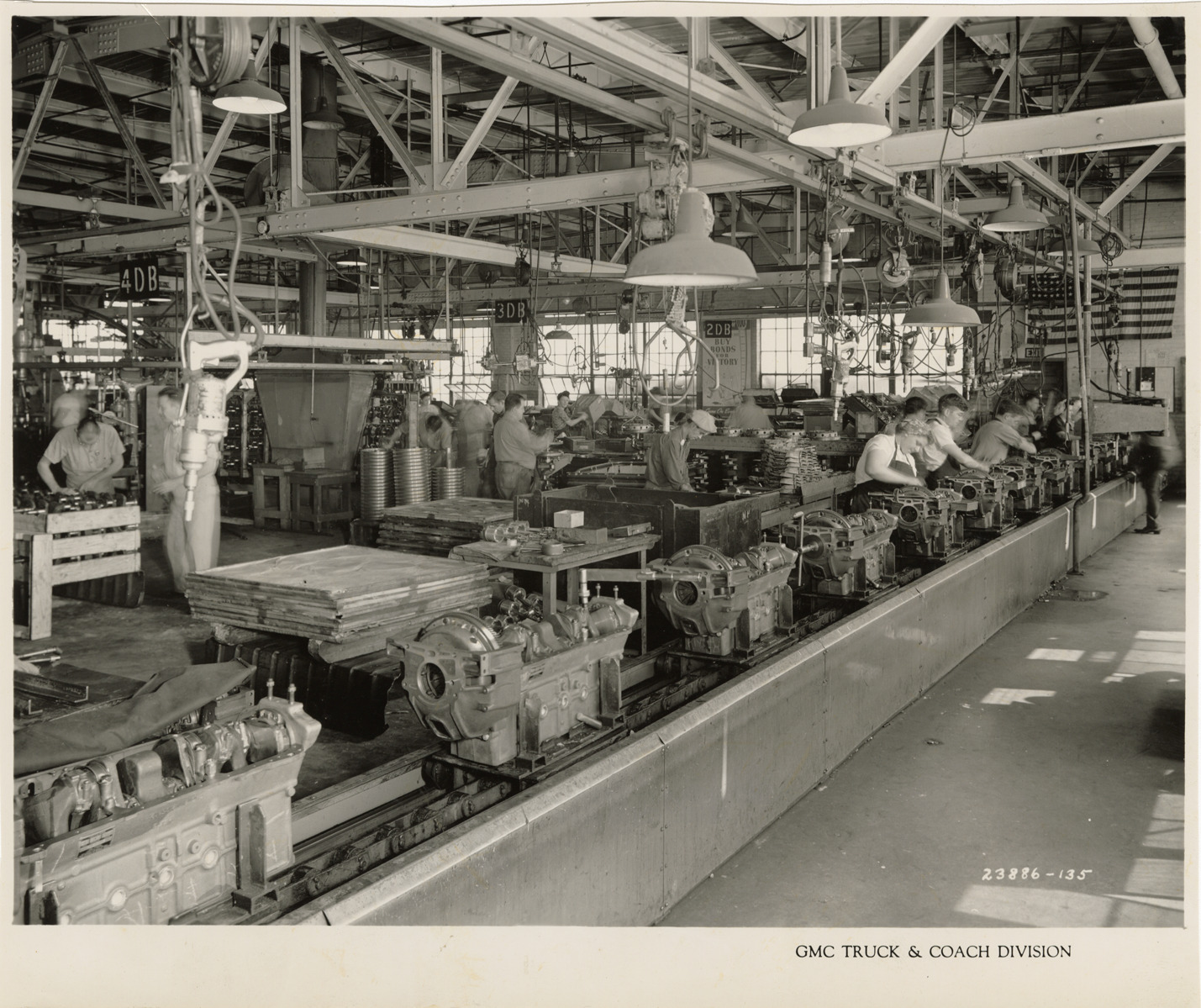 Men and women workers on engine assembly line, Plant 4, GMC Truck & Coach Division factory