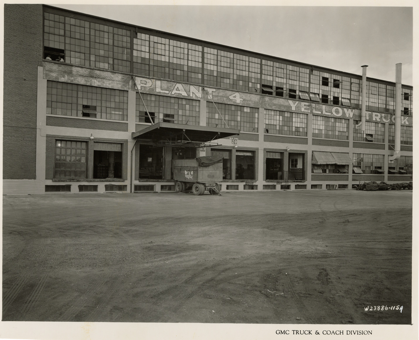 View of the Service Building at Plant 4, Service Division, Bldg. 20, GMC Truck & Coach plant, showing receiving dock. Printed on front: "GMC Truck & Coach Division." Handwritten on back: "Plant 4, Bldg. 20, Service Division. Exterior view of Service Bldg. Exterior view of receiving dock #43, Bldg. 20, south wall, looking north. Factories--GMC, ca. 1943."
