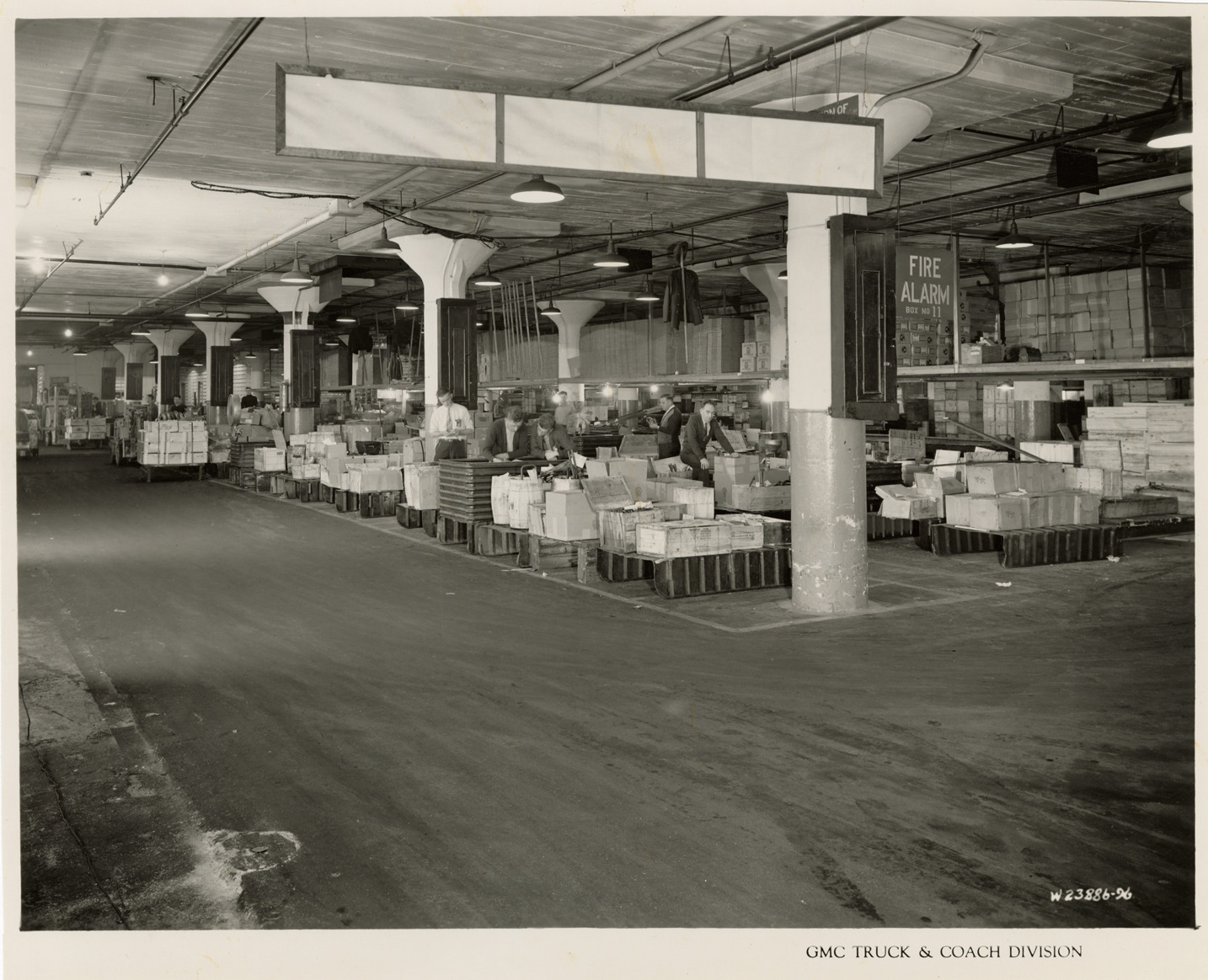 Workers inspecting boxes in receiving and inspection area, Plant 4, GMC Truck & Coach Division factory