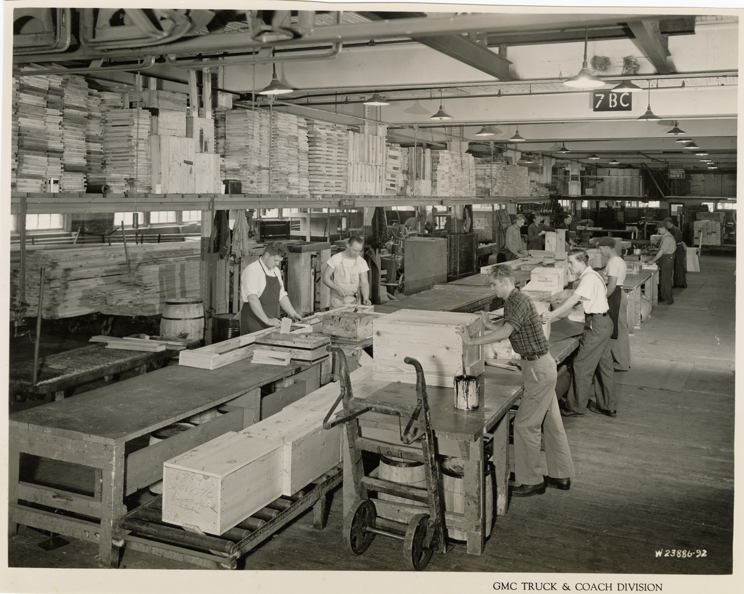 View of workers assembling wooden boxes on the packing line at Plant 4, Service Dept., Bldg. 20, Operations Civilian and Military, GMC Truck & Coach plant. Materials are stored on shelves in background. Printed on front: "GMC Truck & Coach Division." Handwritten on back: "Plant 4, Service Dept., Bldg. 20, Operations Civilian and Military. Packing line, first floor. Factories--GMC, ca. 1943."