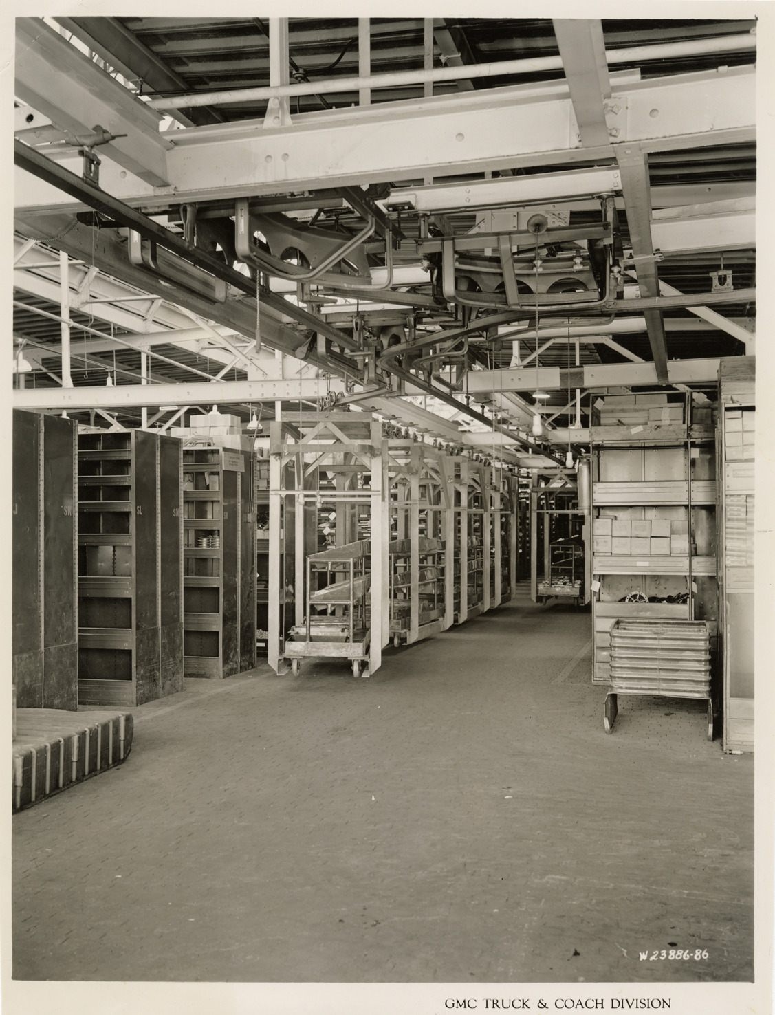 Overhead conveyor system in stock room, Plant 4, GMC Truck & Coach Division factory