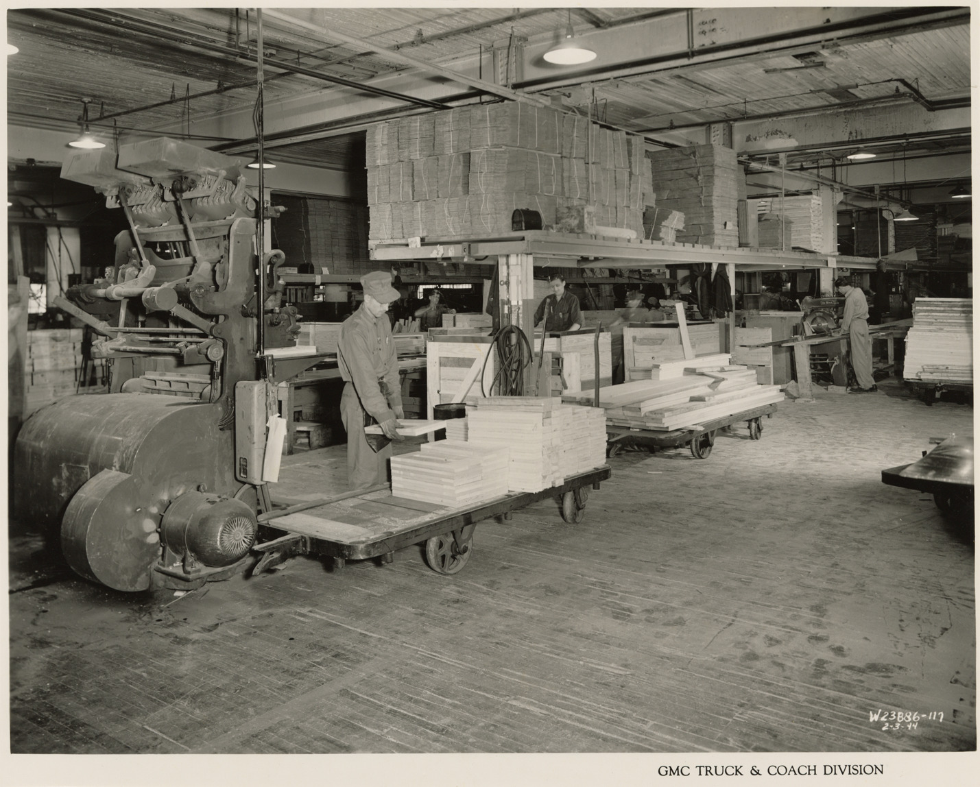 View of workers assembling wooden boxes in Shipping Dept. at Plant 4, Service Dept., Bldg. 20, Operations Civilian and Military, GMC Truck & Coach plant. Materials are stored on shelves in background. Printed on front: "GMC Truck & Coach Division. 2-3-44." Handwritten on back: "Plant 4, Service Dept., Bldg. 20, Operations Civilian and Military. Box Making Dept. in Shipping Dept., 1st floor. Factories--GMC, 2-3-1944."