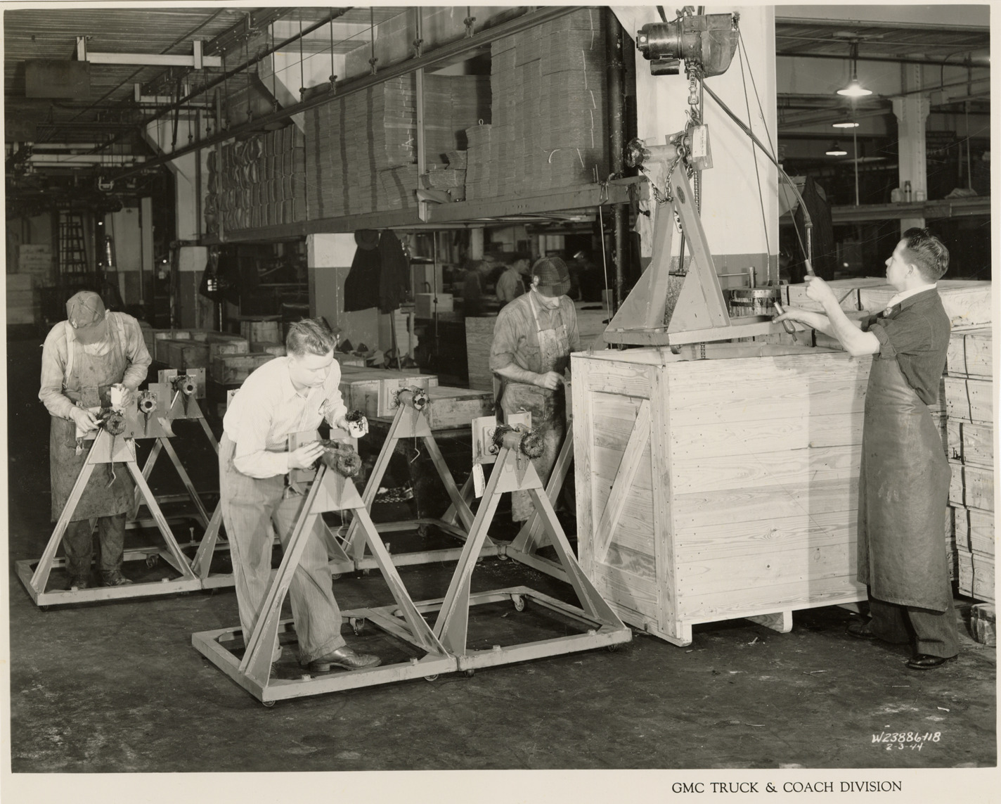 Favorite this☆ Workers boxing special tools, Plant 4, GMC Truck & Coach Division factory Description: View of workers boxing special tools in Shipping Department, Plant 4, Service Dept., Bldg. 20, Operations Civilian and Military, GMC Truck & Coach plant. Printed on front: "GMC Truck & Coach Division. 2-3-44." Handwritten on back: "Plant 4, Service Dept., Bldg. 20, Operations Civilian and Military. Boxing special tools in Shipping Dept., 1st floor. Factories--GMC, 2-3-1944." Details Resource ID: na050340 Subject: Wooden boxes--Michigan--Pontiac Packaging--Michigan--Pontiac Automobile industry workers--Michigan--Pontiac Automobile factories--Michigan--Pontiac GMC Truck & Coach Photographic prints Date Issued: 1944-02-03 Format: 1 photographic print ; 7.75 x 9.5 in. Member of: National Automotive History Collection Filing Location: Factories--GMC, ca. 1943, #4 Rights: Physical rights are retained by DPL. Copyright is retained in accordance with U.S. copyright laws.