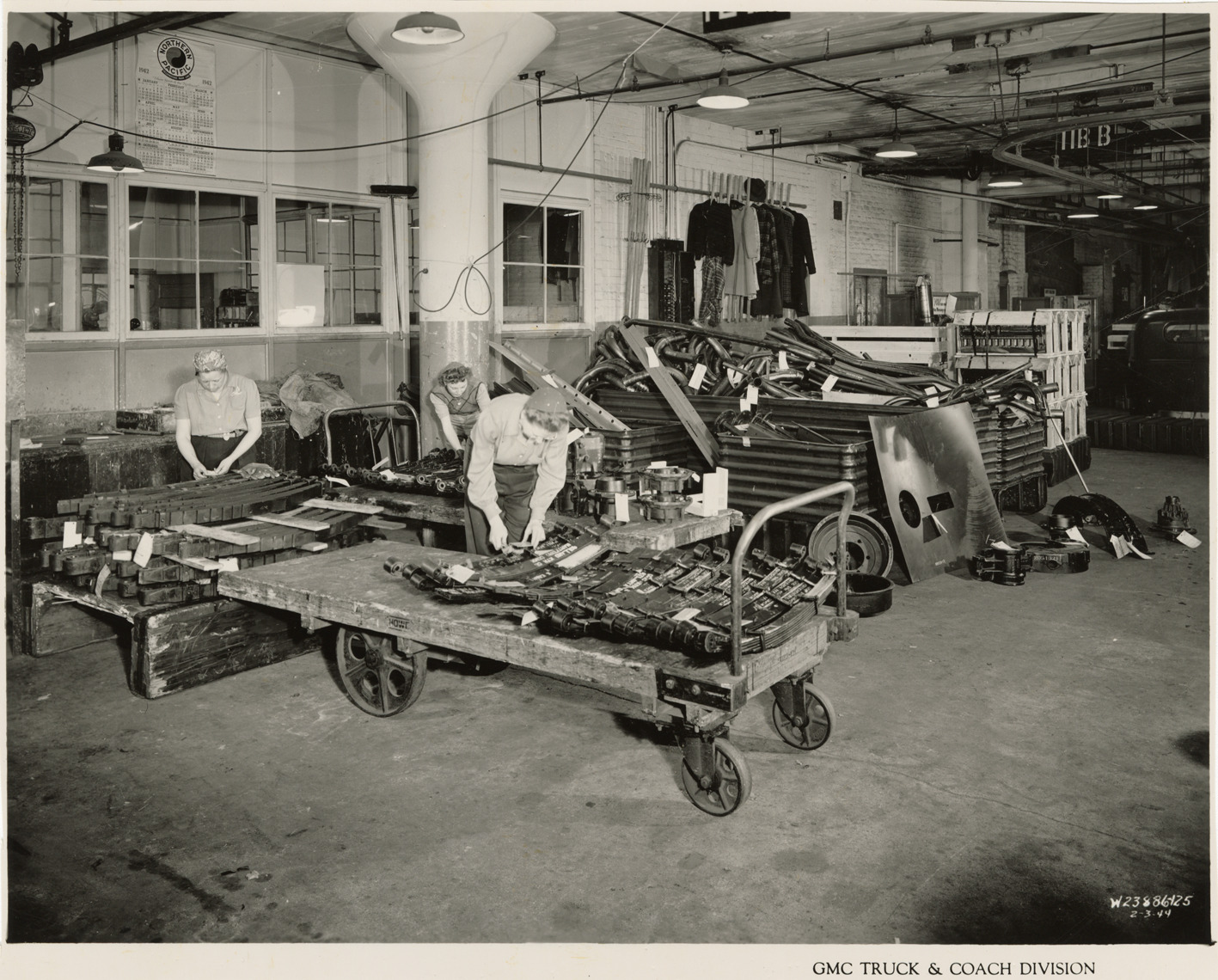Women workers checking material shipment, Plant 4, GMC Truck & Coach Division factory