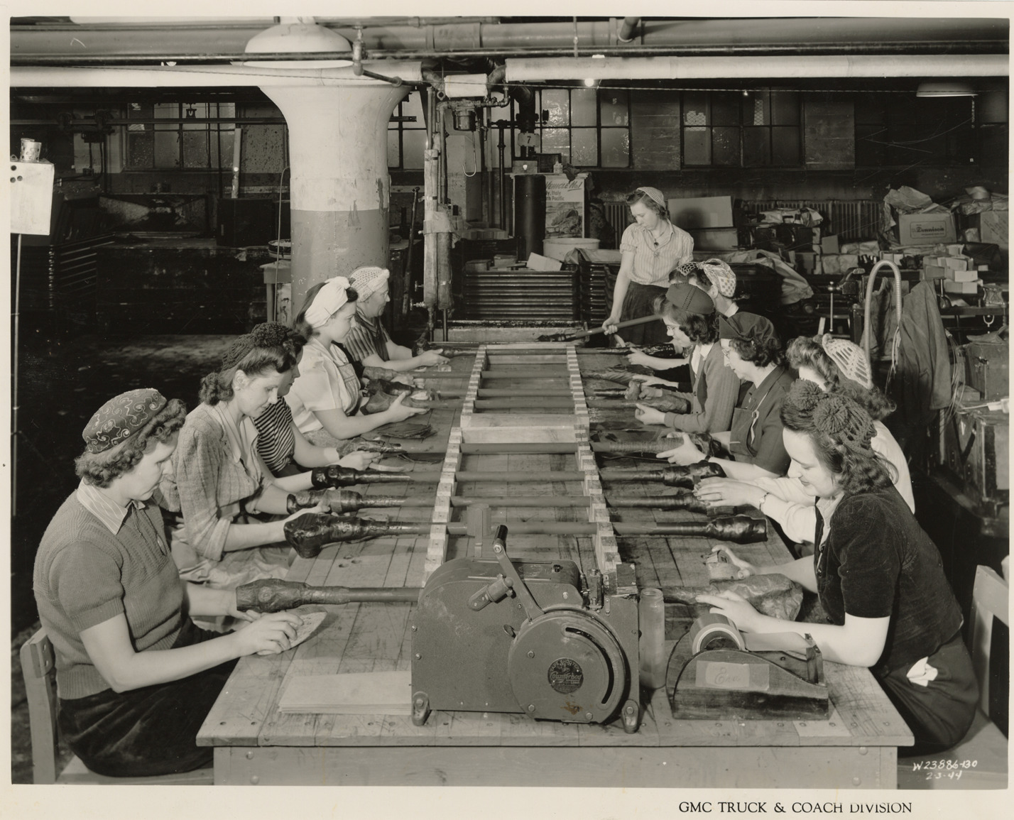 Women workers rustproofing and wrapping shafts at table, Plant 4, GMC Truck & Coach Division factory
