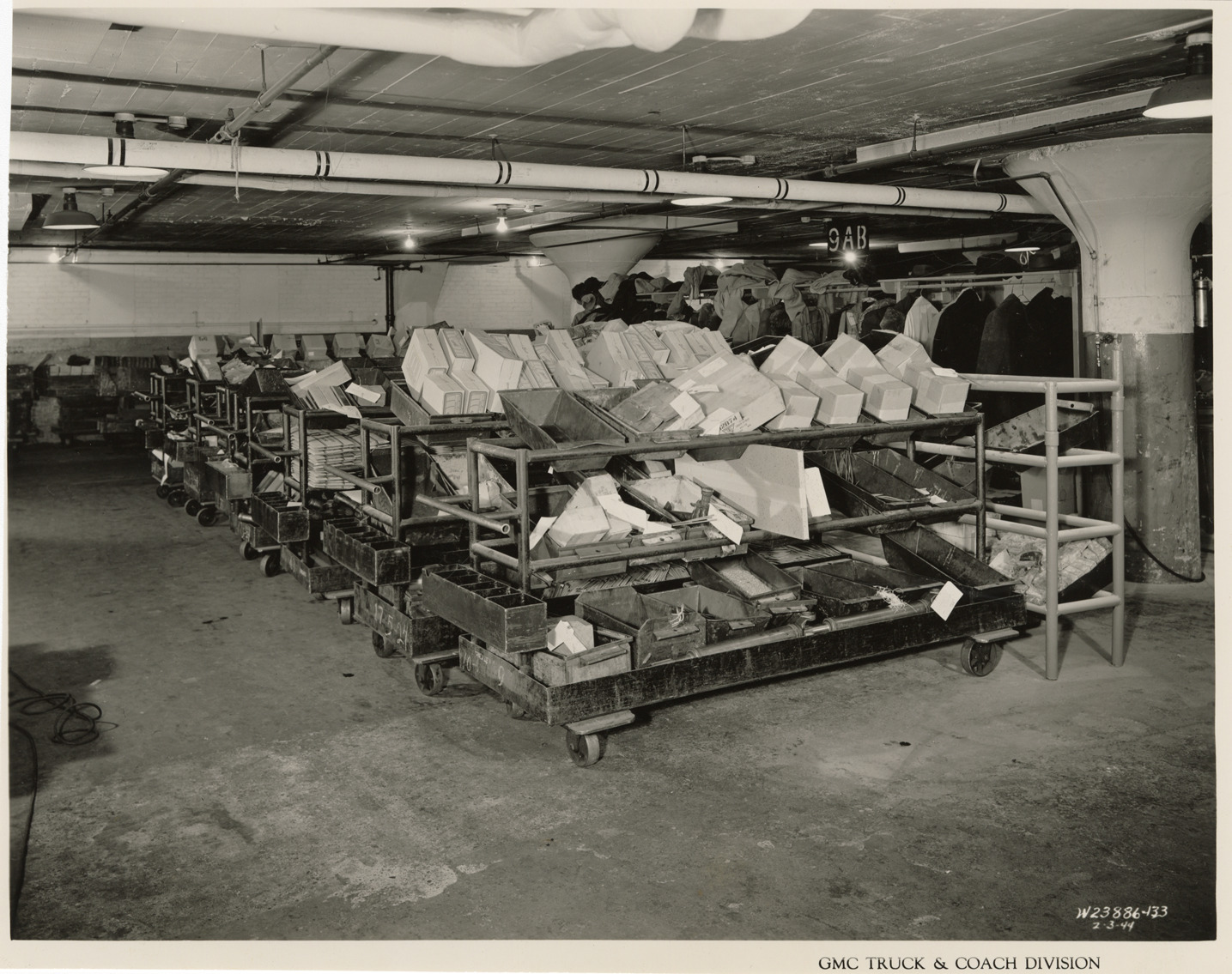 Favorite this☆ Stock picking tables, Plant 4, GMC Truck & Coach Division factory Description: View of material on stock picking tables, Plant 4, Service Dept., Bldg. 20, Operations Civilian and Military, GMC Truck & Coach plant. Printed on front: "GMC Truck & Coach Division. 2-3-44." Handwritten on back: "Plant 4, Service Dept., Bldg. 20, Operations Civilian and Military. Stock picking tables, basement. Factories--GMC, 2-3-1944." Details Resource ID: na050353 Subject: Materials handling Motor vehicles--Parts Automobile factories--Michigan--Pontiac GMC Truck & Coach Photographic prints Date Issued: 1944-02-03 Format: 1 photographic print ; 7.75 x 9.75 in. Member of: National Automotive History Collection Filing Location: Factories--GMC, ca. 1943, #5 Rights: Physical rights are retained by DPL. Copyright is retained in accordance with U.S. copyright laws.