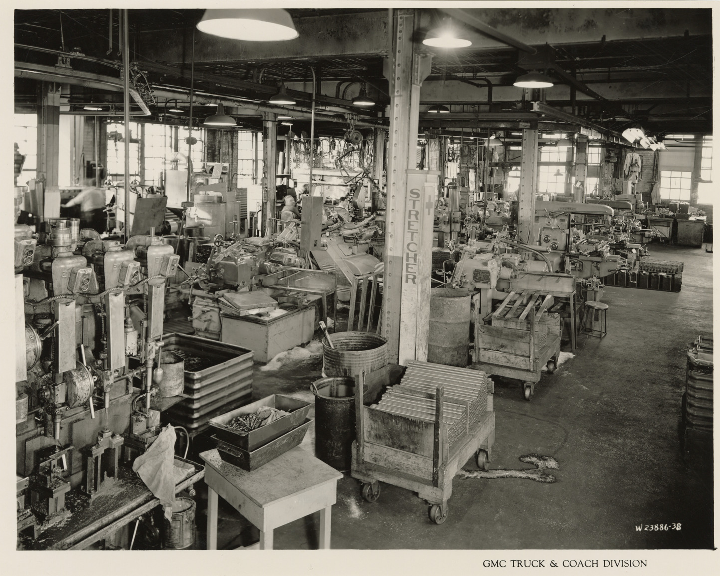 View of the Maintenance Dept., Plant 4, Service and Maintenance, Bldg. 23, GMC Truck & Coach plant. Printed on front: "GMC Truck & Coach Division." Handwritten on back: "Plant 4, Service and Maintenance, Bldg. 23, Maintenance Dept., 1st floor. Factories--GMC, ca. 1943."