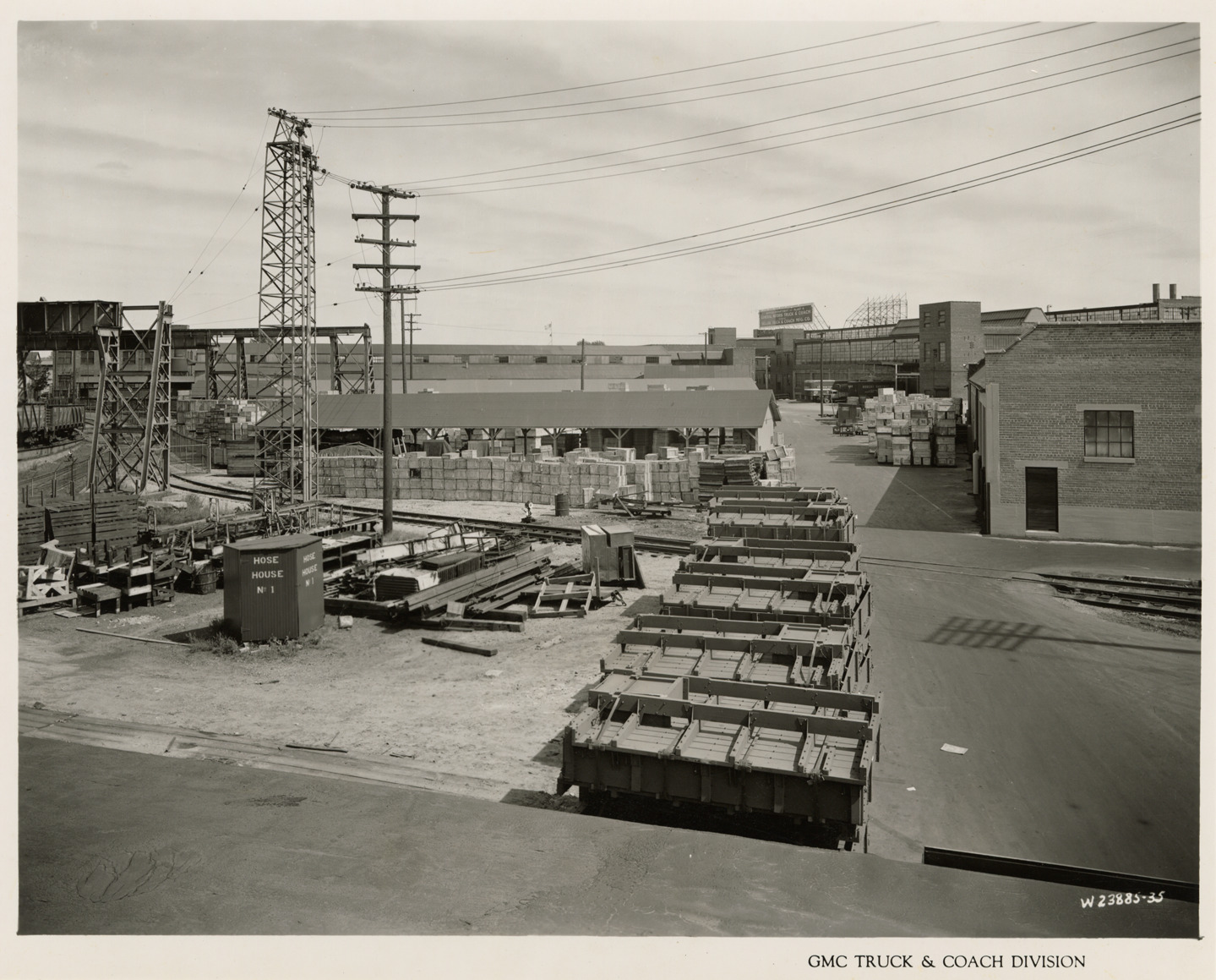 Yard storage of boxes, Plant 4, Building 25, GMC Truck & Coach Division factory