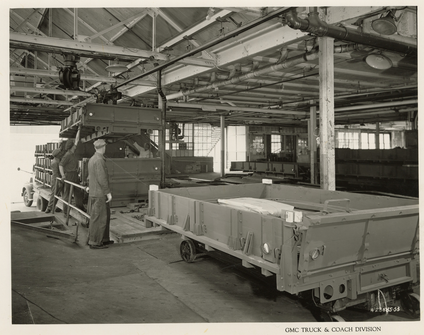 Workers unloading cargo bodies from trailer on receiving dock, Plant 3, GMC Truck & Coach Division factory