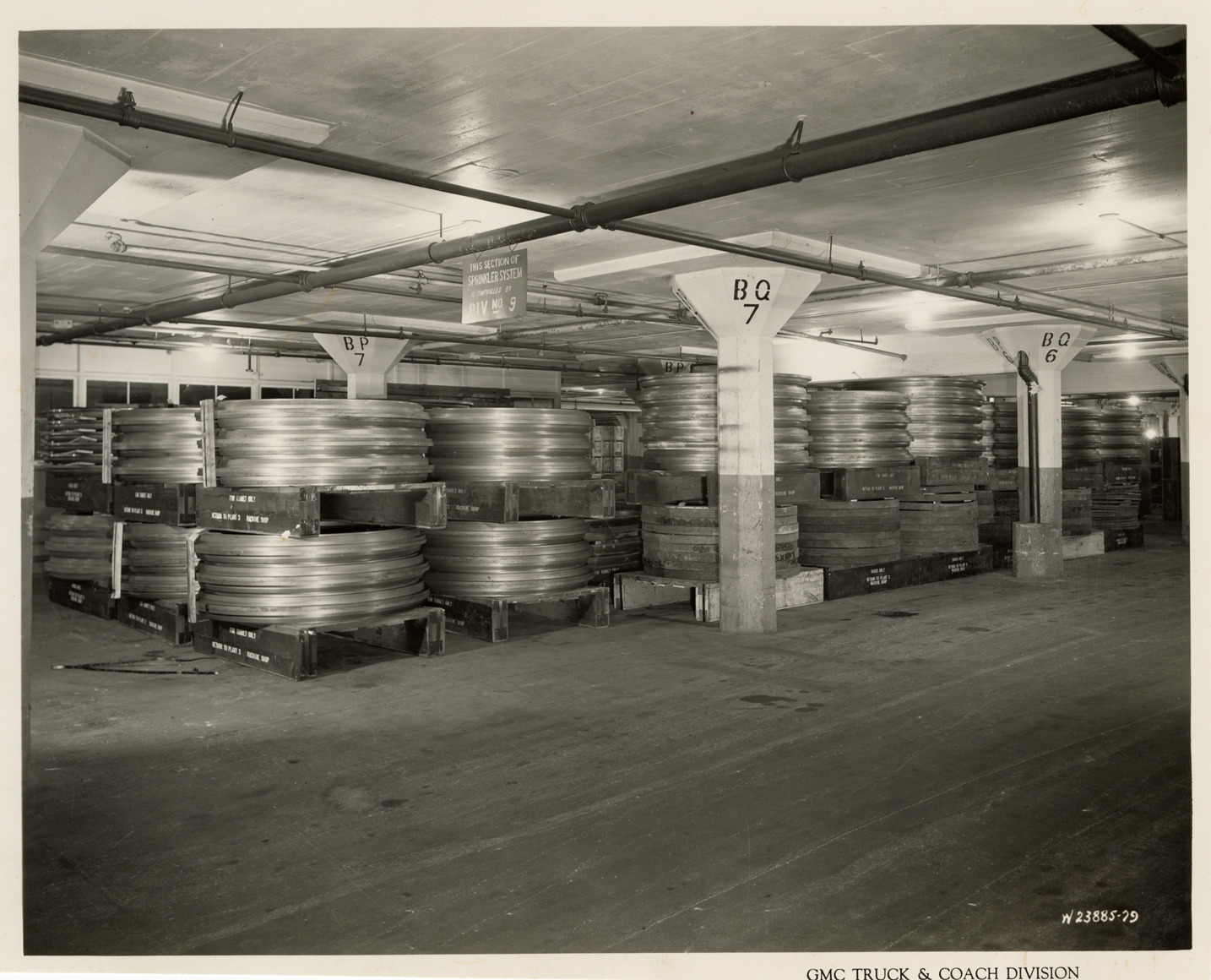 View of armored car turret rings in basement storage, Plant 3, Building 17, GMC Truck & Coach plant. Printed on front: "GMC Truck & Coach Division." Handwritten on back: "Plant 3, Bldg. 17. Basement & part of Bldg. 16, Mfg. Division. Armored car turret rings stored in basement of Bldg. 17. Factories--GMC, ca. 1943."