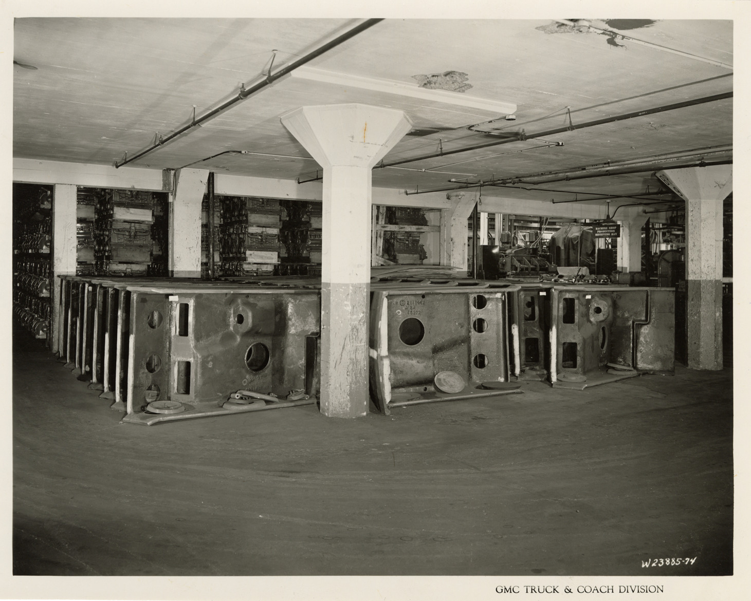 Armored car turret material in basement storage, Plant 3, GMC Truck & Coach Division factory