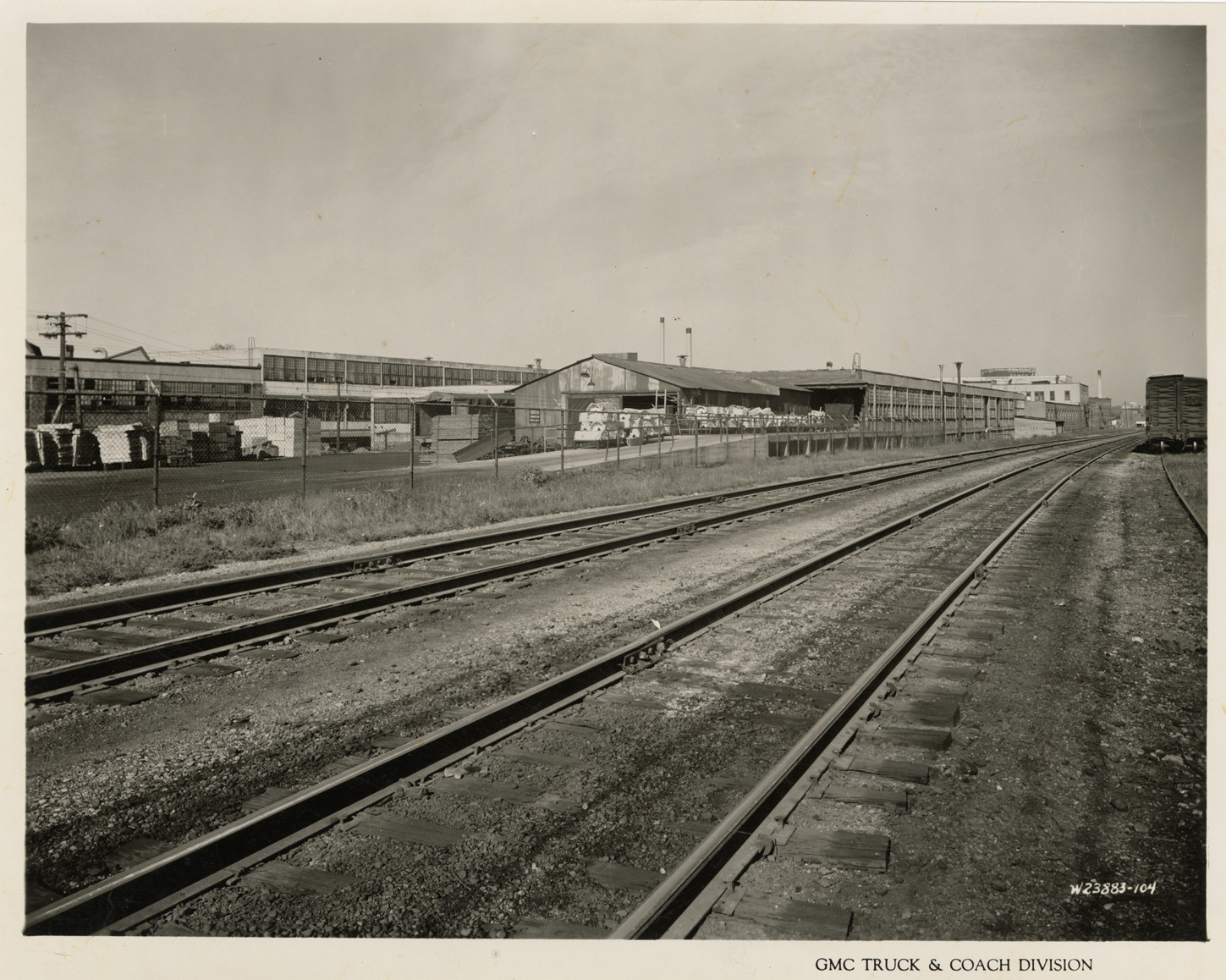 View of Plant 1, GMC Truck & Coach plant. Railroad tracks in foreground. Printed on front: "GMC Truck & Coach Division." Handwritten on back: "Plant 1. Exterior view of east side of plant, looking north down G.T.R.R. tracks. Factories--GMC, ca. 1943."