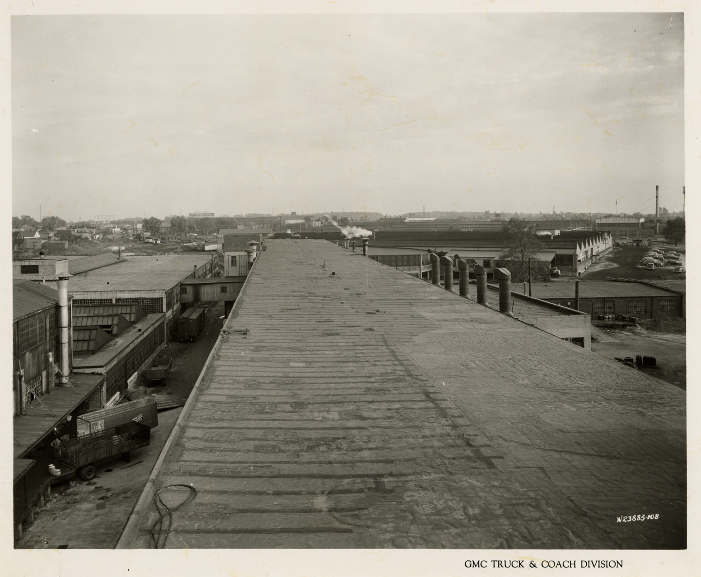 Favorite this☆ Driveway between buildings, Plant 1, GMC Truck & Coach Division factory Description: Bird's-eye view of driveway between buildings of Plant 1, GMC Truck & Coach plant. Printed on front: "GMC Truck & Coach Division." Handwritten on back: "Plant 1. Top exterior view of driveway between bldgs., looking south. Factories--GMC, ca. 1943." Details Resource ID: na050431 Subject: Automobile factories--Michigan--Pontiac GMC Truck & Coach Driveways--Michigan--Pontiac Photographic prints Date Issued: 1943 (year approximate) Format: 1 photographic print ; 8 x 9.75 in. Member of: National Automotive History Collection Filing Location: Factories--GMC, ca. 1943, #9 Rights: Physical rights are retained by DPL. Copyright is retained in accordance with U.S. copyright laws.