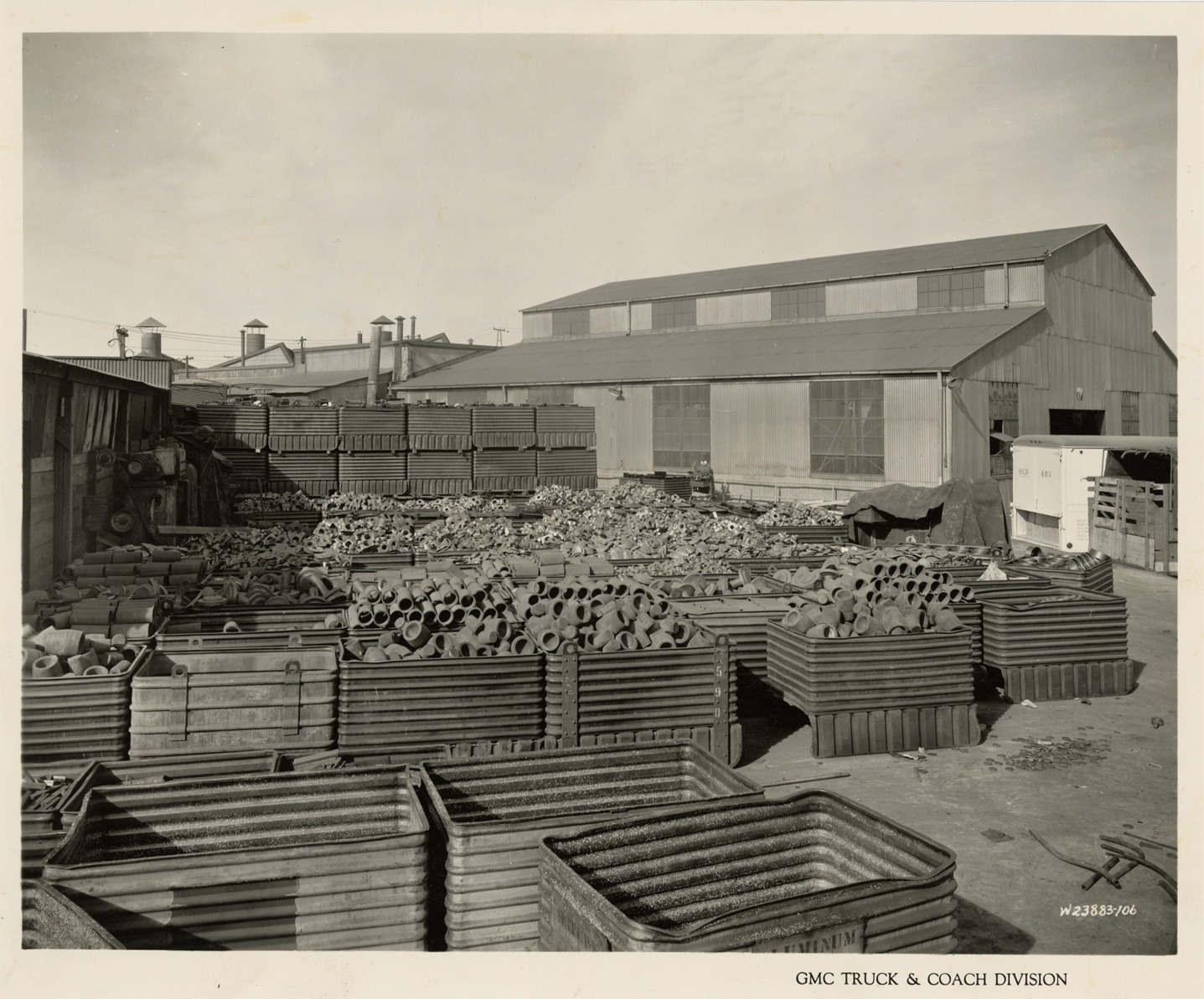 Favorite this☆ Casting Storage building, Plant 1, GMC Truck & Coach Division factory Description: View of the Casting Storage building, Plant 1, GMC Truck & Coach plant, showing outdoor bins holding parts. Printed on front: "GMC Truck & Coach Division." Handwritten on back: "Plant 1. Close-up exterior view of Casting Storage bldg., showing material stored outdooors, looking west toward machine shop. Factories--GMC, ca. 1943." Details Resource ID: na050441 Subject: Automobile factories--Michigan--Pontiac GMC Truck & Coach Storage facilities--Michigan--Pontiac Bins--Michigan--Pontiac Photographic prints Date Issued: 1943 (year approximate) Format: 1 photographic print ; 8 x 9.75 in. Member of: National Automotive History Collection Filing Location: Factories--GMC, ca. 1943, #9 Rights: Physical rights are retained by DPL. Copyright is retained in accordance with U.S. copyright laws.