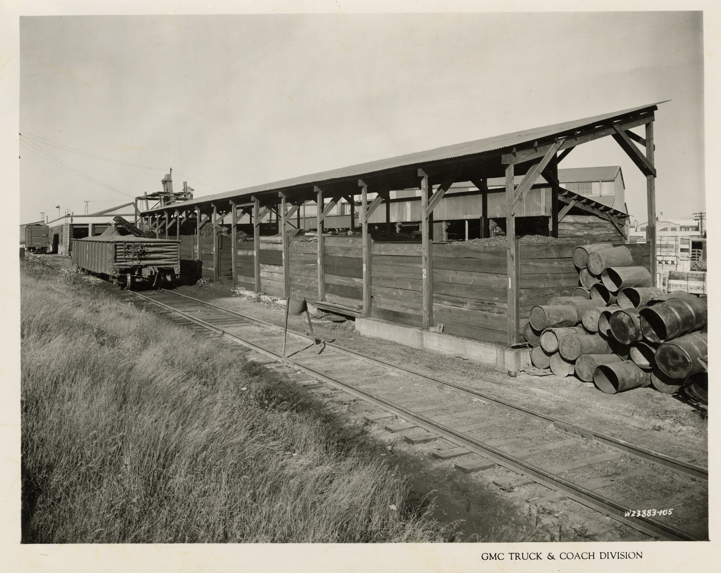View of railroad spur at scrap loading dock at the GMC Truck & Coach plant. Metal barrels in foreground; freight cars in background. Printed on front: "GMC Truck & Coach Division." Handwritten on back: "Plant 1. Exterior view of south rail spur at scrap loading dock, looking west. Factories--GMC, ca. 1943."
