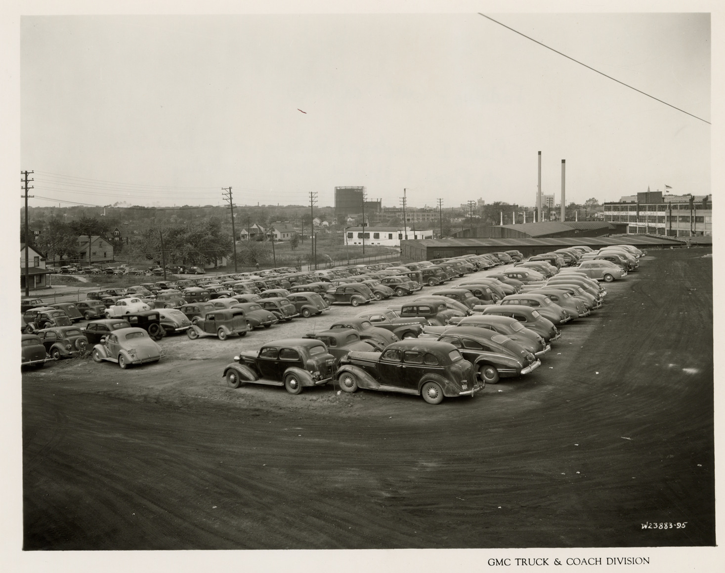 View of cars in the employee parking lot, Plant 1, GMC Truck & Coach plant. Printed on front: "GMC Truck & Coach Division." Handwritten on back: "Plant 1. Employees parking lot on west side of Plant 1 machine shop, paralleling Franklin Rd., view looking northwest. Factories--GMC, ca. 1943."